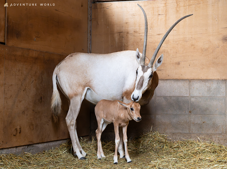 アドベンチャーワールドでは、動物の老齢化や血統の偏り、オス個体の不在などにより、2010年以降シロオリックスの繁殖が途絶えておりました。シロオリックスは、JAZA(日本動物園水族館協会)より、種別調整対象種* に指定されており、遺伝的多様性維持と動物移動の最適化を主眼においた、全国的な繁殖・飼育計画をもとに管理されています。これらの計画のもと、2024年10月に長野市茶臼山動物園よりオス1頭、姫路セントラルパークよりメス1頭を迎え入れたことにより、今回の出産に至りました。