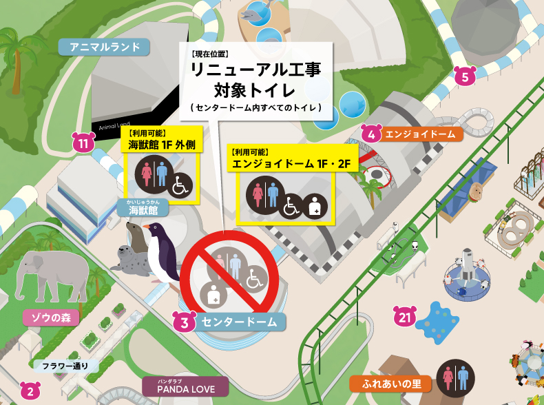 期間中、リニューアル対象のトイレはご利用いただけません。ご不便をおかけしますが、何卒ご理解のほどお願い申し上げます。