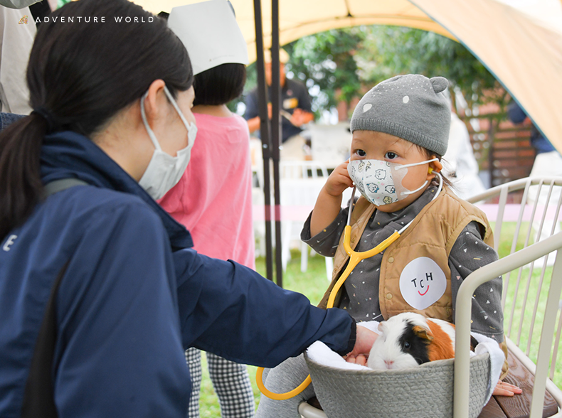 イヌやモルモットとのふれあいコーナーでは、モルモットの聴診体験も行われました。動物たちとのふれあいを通して、いのちのあたたかさを間近に感じた子どもたちは、たくさんの笑顔があふれていました。