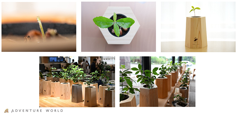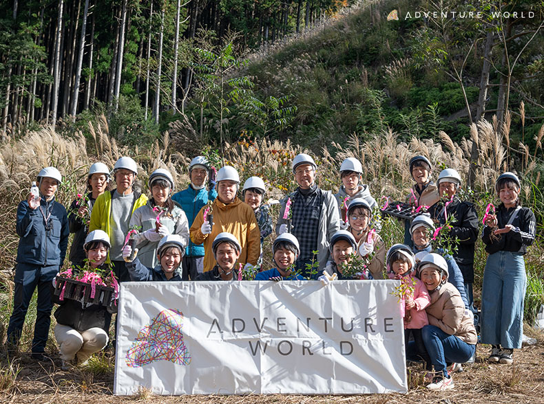アドベンチャーワールドは、和歌山発の林業ベンチャーである株式会社ソマノベース(和歌山県田辺市、代表取締役社⻑:奥川 季花 様、以下:ソマノベース)の「MODRINAE(戻り苗)」に参加し、パーク運営に関わる社員約350名が、2年間かけてどんぐりから苗を育ててまいりました。この度、育ててきた苗を10月29日(水)、11月19日(水)の2日にかけて、田辺市中辺路町の森に植樹しました。