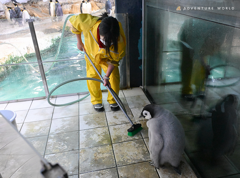 エンペラーペンギンの赤ちゃんは掃除するスタッフの様子をじっと見つめ、まるで静かに見守っているようでした。