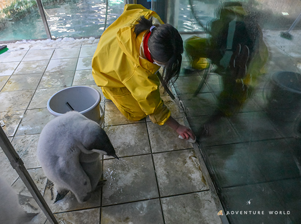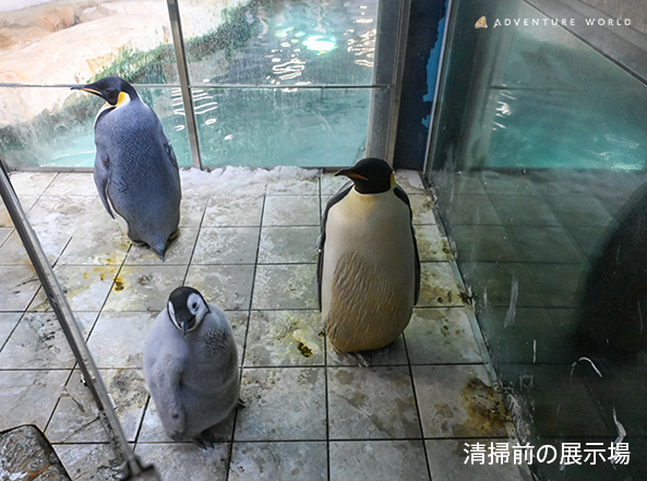 まずは、2025年9月30日に誕生したエンペラーペンギンの赤ちゃんと親鳥が暮らす育雛スペースを飼育スタッフがデッキブラシやスポンジで丁寧に清掃しました。