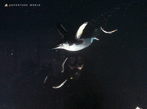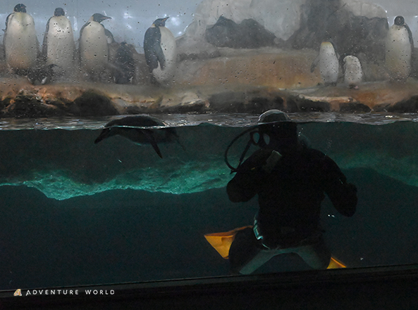 また、ダイバーによるペンギンプールの水中ガラス清掃も実施しました。ガラスに付いた海水の塩や汚れを落とし、水中の見え方もすっきり。作業の間、ペンギンたちがダイバーのそばに寄っていく場面もありました。