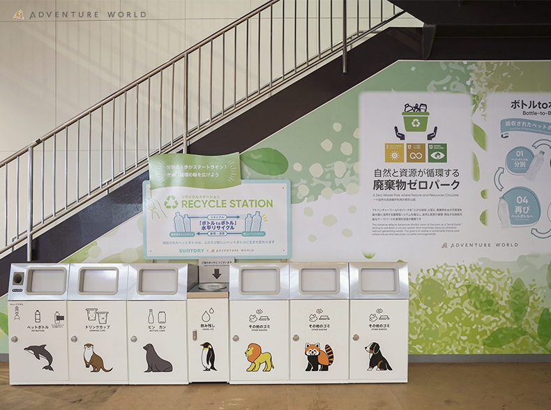 アドベンチャーワールドは、サントリーホールディングス株式会社とのパートナーシップの一環として、パーク内にリサイクルステーションを設置し、ご来園されるゲストが分別に参加することで、使用済みペットボトルが再びペットボトルへ生まれ変わる「ボトルtoボトル」水平リサイクルにつなげる取り組みを開始しました。