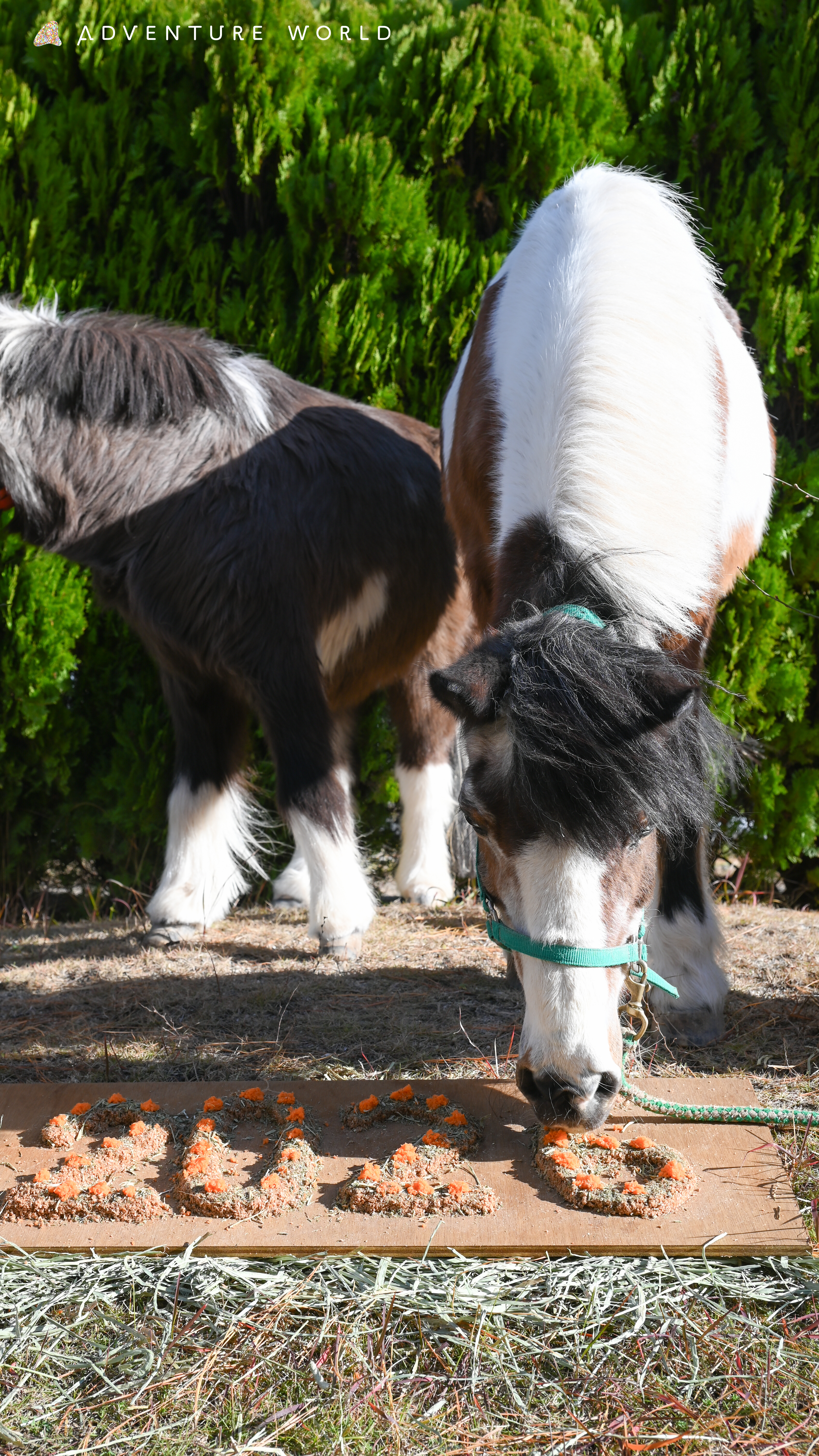 ウマ・ポニー・ミニチュアホースがゲストの皆様をお出迎え!新年フォトプロップスでウマたちとの記念撮影が楽しめます。さらに、「開運!蹄鉄あてゲーム」を開催!的に当たると幸運のお守りである蹄鉄やウマとのツーショット記念写真をプレゼントいたします。