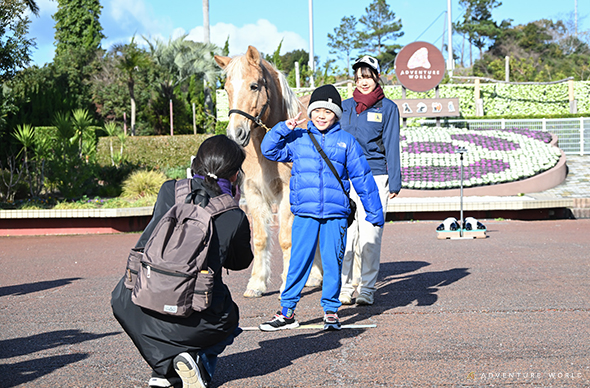「大きい馬の馬車」「ミニチュアホースのお散歩」のアトラクションに参加すると新年特別パネルと記念撮影ができます。