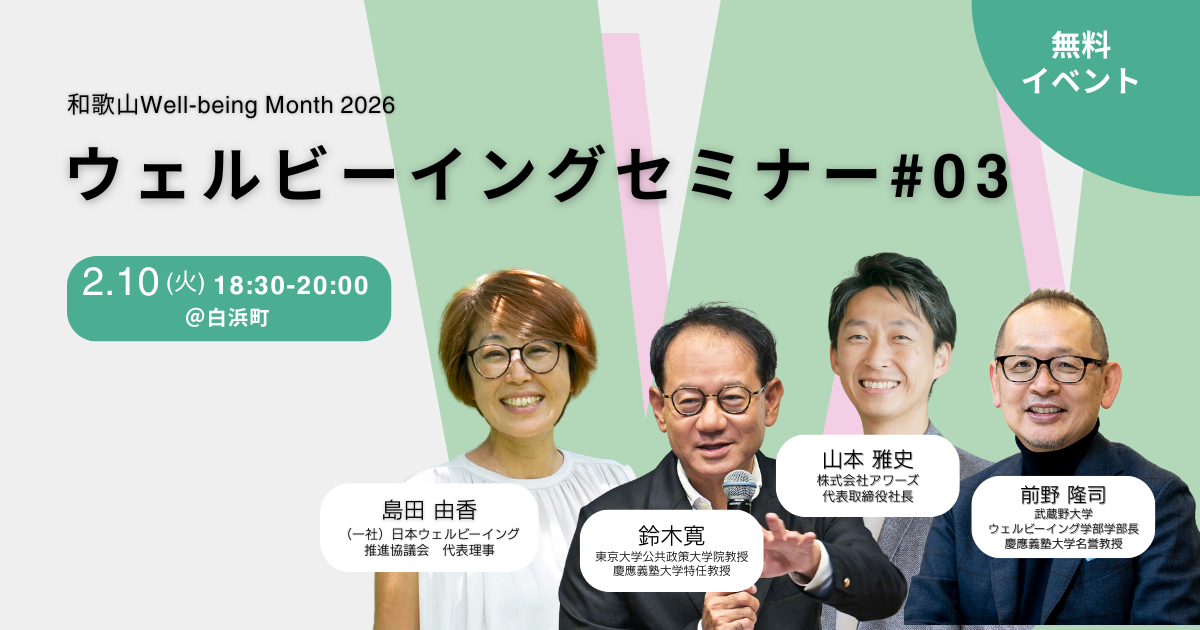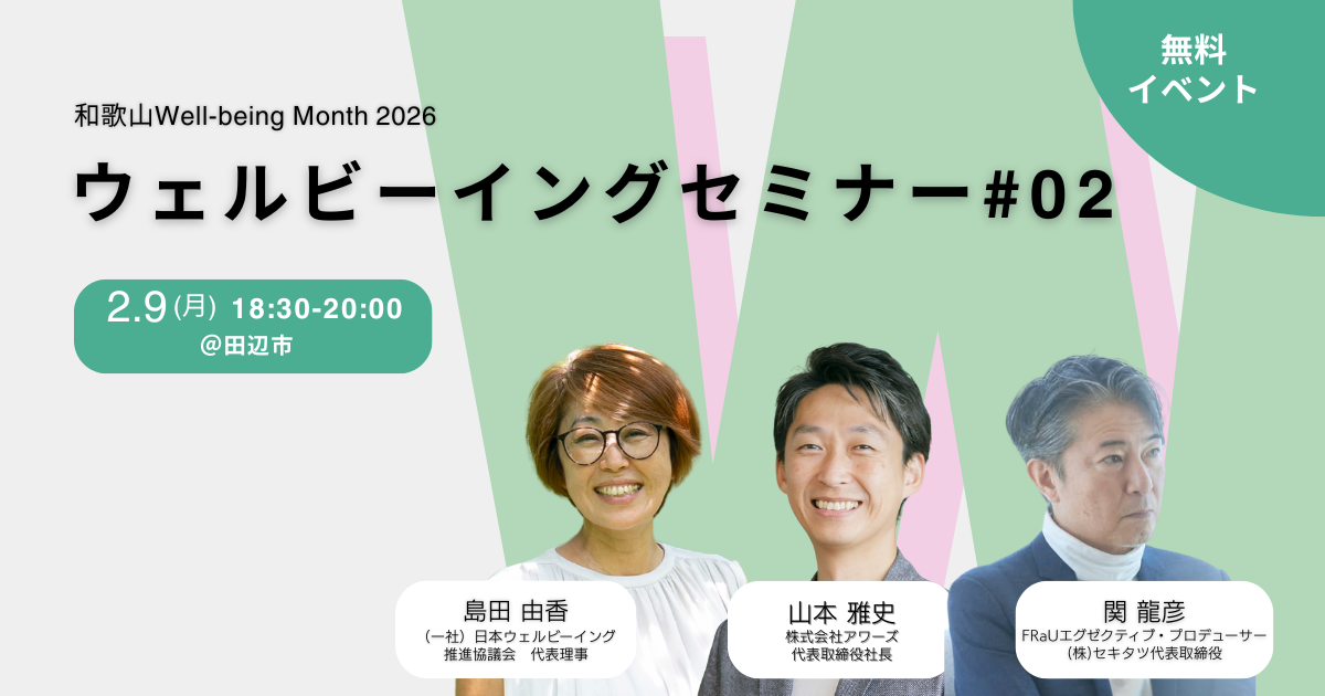 とにかく魅力があふれている和歌山。ここだからこそウェルビーイングを実際に体験できる場を皆さんと一緒に創りながら、2月の1ヶ月間「和歌山Well-being Month 2026」を展開してまいります。ウェルビーイングとは「幸せ・継続的幸福」と訳されますが、シンプルに「いい(well) 状態(being)」を意味します。どんな時に自分がウェルビーイングなのかを知っていると、私たちは次の言動を選ぶことができ、どんな状況であってもウェルビーイングでいることができるようになります。