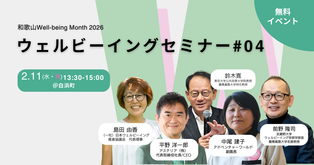 そのためのヒントがいっぱい詰まったセミナーや、実際に体を動かすことでウェルビーイングを実体験できる魅力的なイベントがぎゅっと集まった1ヶ月間。2月の和歌山で心も体も頭も使って、是非ご自身のウェルビーイングを知ってください。日本のウェルビーイングの底上げをすることが私のパーパス(大いなる目的)です。それを地域を通じて実現していきたい。その舞台として私の大好きな場所である和歌山を選んだのは、和歌山にはウェルビーイングであれる要素がいっぱいにあふれているからです。和歌山からウェルビーイングを広げていきたい。“また来たい・また会いたい”と思えるつながりを、この和歌山の地から全国、そして世界へ届けていきます。たくさんの皆さまのお越しを和歌山でお待ちしています。