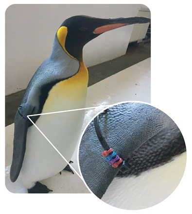 ペンギンの翼(フリッパー)についている名札のことです。ペンギンそれぞれにこの名札がついており、飼育スタッフはこれをみてペンギンを見分けています。食事などペンギンたちの健康管理に欠かせないとても重要な役割があります。