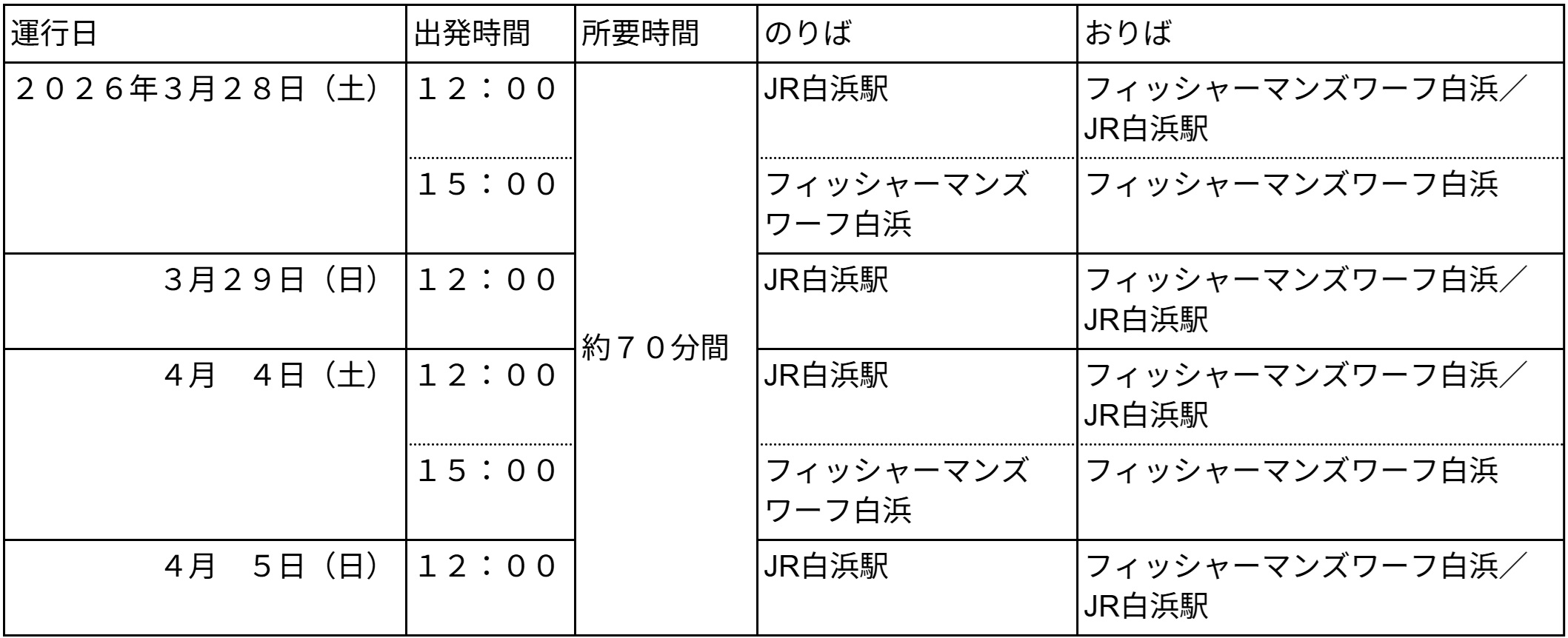 2026年3月28日(土)、29日(日)、4月4日(土)、5日(日) 4日間 計6便