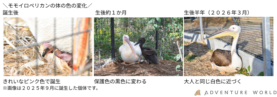 アドベンチャーワールドでは、2026年3月6日(金)と7日(土)に「モモイロペリカン」の赤ちゃんが2羽誕生しました。モモイロペリカンのヒナの成長はとても早く、生まれた直後はピンク色ですが、生後2週間ほどで保護色の黒色へ変化し、生後3~4か月ほどで大人と同じ白色の羽に徐々に生え変わり始めます。その体の色の変化や、親鳥に大切に育てられる様子を、あたたかく見守ってください♪