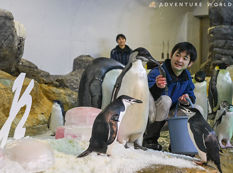 お祝いとして氷のケーキをプレゼント!大人のペンギンもそばで見守っている様子でした。