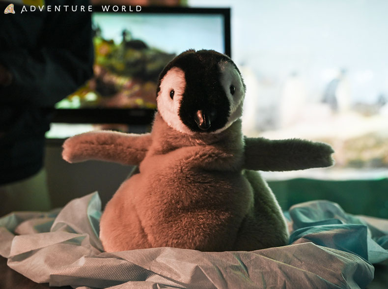 会場では、アニマルエデュテイナー(飼育スタッフ)によるレクチャーを実施し、誕生から現在に至るまでの成長過程をお伝えしました。また、パークスタッフが製作したペンギンロボットも登場!40日齢の赤ちゃんを再現したペンギンロボットは、羽ばたいたり、首を振ったりといった本物さながらのリアルな動きをお披露目しました。このロボットを活用し、赤ちゃんへの給餌の様子を再現しながら、子育てのサポートや工夫についてご紹介しました。