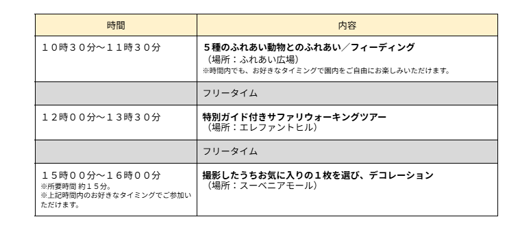 ■時間  :午前10時00分~午後4時00分 ※パークを自由に回るフリータイムもあり