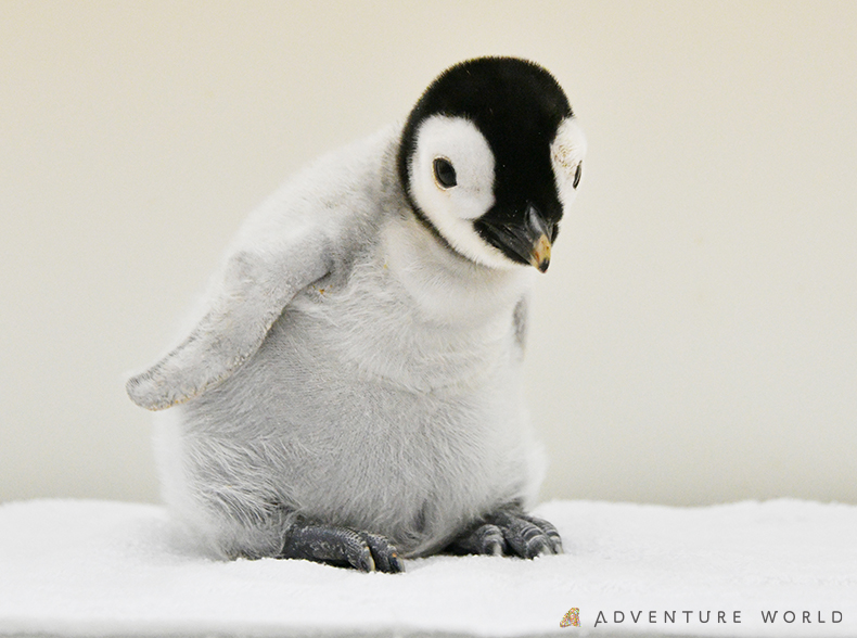 開園前、飼育スタッフの手で若いペアが抱いていた擬卵と赤ちゃんを入れ替えました。初めはお腹を持ちあげ、しきりに赤ちゃんの様子を確認するなどしていましたが、しばらくすると落ち着いて赤ちゃんを抱えています。