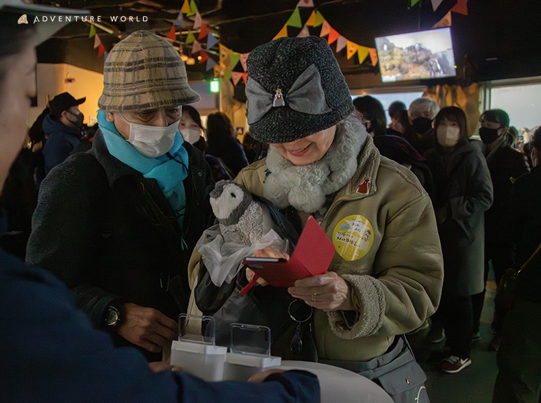 飼育スタッフによる、これまでの成長を振り返るトークイベントを実施しました。今朝のエンペラーペンギンの赤ちゃんの体重は14.8kg。誕生時の295.9gから約50倍の重さにまで成長しました。赤ちゃんの成長の喜びをゲストの皆様と分かち合いました。