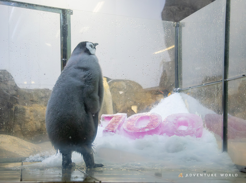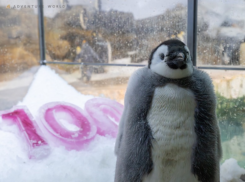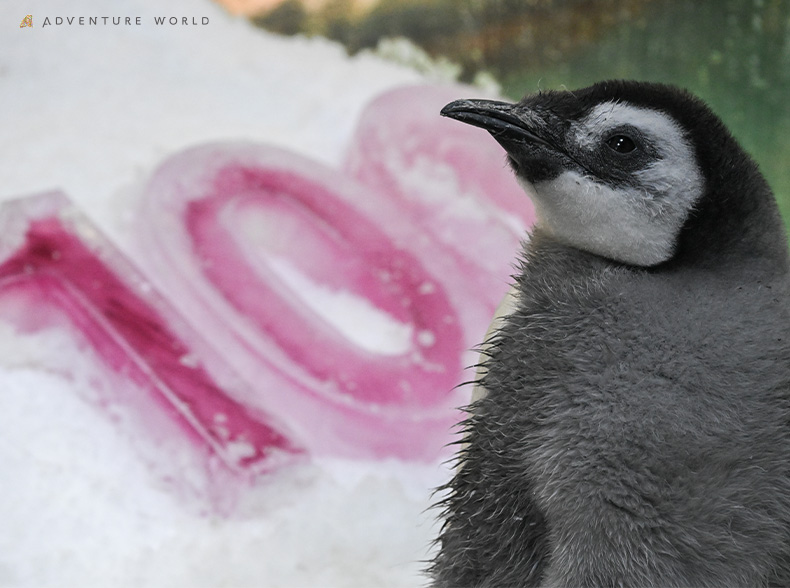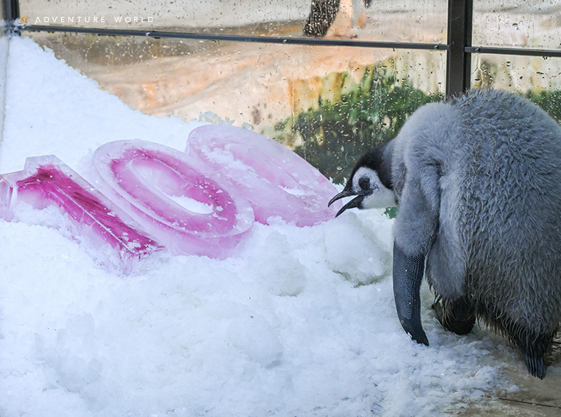 2025年9月30日に誕生したエンペラーペンギンの赤ちゃんが、本日1月8日(木)に100日齢を迎えました!100日齢にちなみ「100」をかたどった氷を赤ちゃんが暮らす育雛スペースに設置し、記念撮影を行いました。